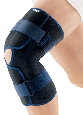 Detachable warming orthosis with Velcro and tapes. Due to the composition of raw materials, elastic. Has a round opening at the knee. The hinges exclude the possibility of bending and retain only flexion-extension. This model is used most often by athletes. All sizes available, including childrens.