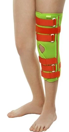 Knee support for a child with an adjustable degree of fixation. Attaches to the leg with Velcro and tape. Inside the split structure there are removable simulated metal tires that can be replaced with spiral stiffeners. The product provides fixation and lateral stabilization of the knee. When worn regularly, it helps to reduce swelling and improve blood supply to soft tissues near the joint.