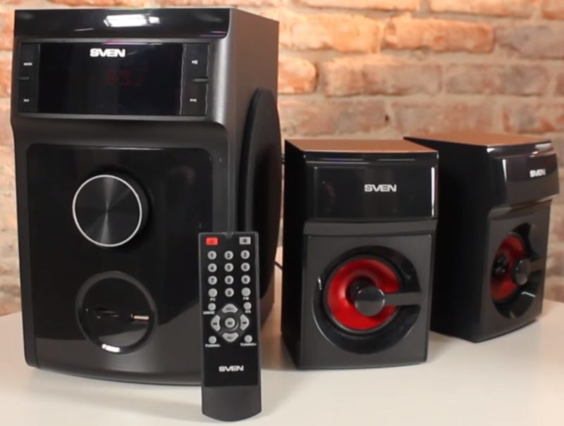 SVEN MS-302 is supplied with a warranty card, remote control, audio cable, instruction manual, antenna wire and batteries. The multifunctional speaker system made in China consists of three units: a subwoofer and two satellites, the body of which is made of MDF in black. On the right panel of the subwoofer there is an 11 mm woofer covered with fabric and protection. The output power is 20 W, the frequency range is 40-150 Hz. The dimensions of the subwoofer enclosure are 15.9 x 27.2 x 24.5 cm.
