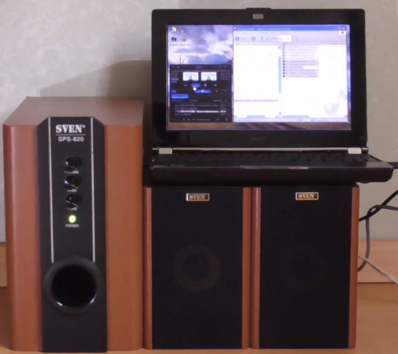 SVEN SPS-820 is made in a classic design, available in black and brown. The two satellites and the subwoofer are made of chipboard and are magnetically shielded. Speakers can be placed on a table, shelves, wall mount is also available.