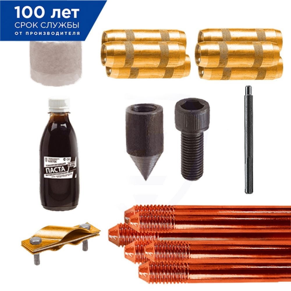 A versatile kit that has earned its popularity due to its large coverage and ease of installation and maintenance. It can be used both for domestic needs and for industrial facilities. A high-tech filler is used in the composition of the electrode, which always maintains the leaching level evenly, despite the weather conditions. Over time, the concentration of electrolyte in the soil will not only be maintained, but will also increase, which means an increase in electrical conductivity, and hence a decrease in risks for the protected object in terms of electrical safety.