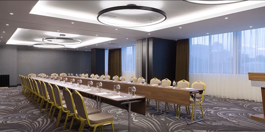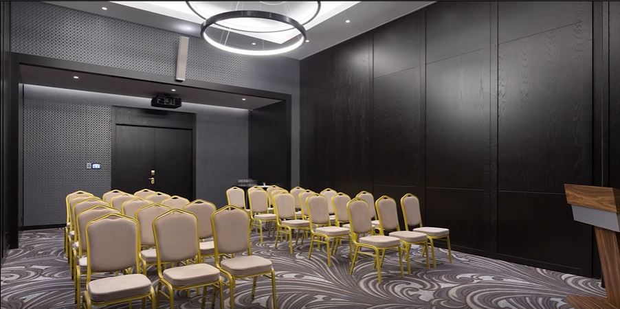 The five-star hotel has provided the premises with a chic design and quality furniture. The light colors of the furnishings are diluted with the gilding of comfortable chairs. The hall is decorated with chic designer chandeliers. High-quality lighting provides a comfortable location for spectators and participants.