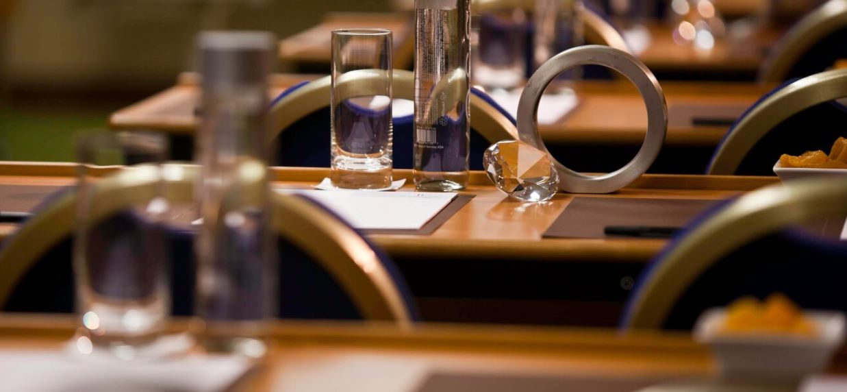 The room is equipped with the necessary items: a long table for the meeting participants and chairs, a buffet table, a rostrum for speakers, and seating. Some halls are equipped with a stage.
