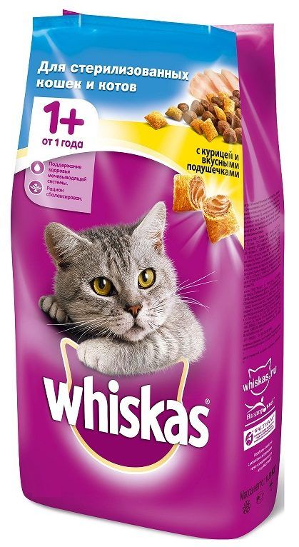 Whiskas is a crunchy, pate-filled dry food for sterilized cats. Differs in a balanced combination of nutrients and nutrients. Helps to improve metabolism and enhance the immune system. Enriched with Vitamin E, A, Zinc, Taurine and Omega-6. Combines phosphorus and calcium in the required amount. The components and fiber are easily digestible. The dry texture of the food helps to remove plaque. Two kilograms of feed can be purchased for 450 rubles.