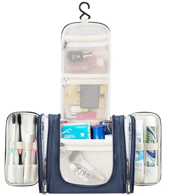 When folded, the model takes up little space. It can be hung on a secure hook in the wardrobe, bathroom or shower. The practical accessory is equipped with carrying handles. The site presents attributes in blue and green. According to customer reviews, the cosmetic bag is very high quality. The average price is 815 rubles.