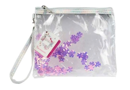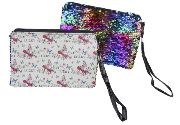 A small rectangular cosmetic bag made in China has an unusual design. The buyer can choose a model with a butterfly print or an accessory covered with sequins, shimmering in all the colors of the rainbow.