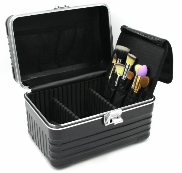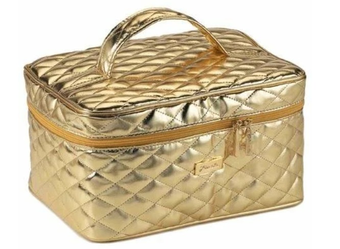 It is a capacious attribute with rigid walls. It safely stores a stock of cosmetics from miniature tubes to glass perfume bottles. Inside, there is usually a mirror and many compartments.