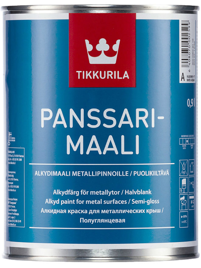 Alkyd paint, new generation designed for metal surfaces, galvanized, aluminum and steel, differs in the content of active substances with anti-corrosive pigments, which protects against external factors. The type of paint is suitable for painting external surfaces, ideal for roofs, drains, railings and gutters. Tikkurila Panssarimaali simply and easily acquires the desired shade, it is perfectly applied to the surface.