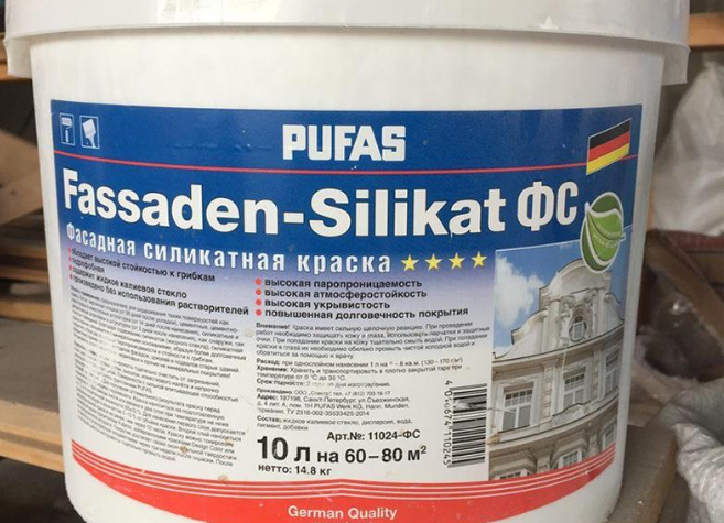 Retains a presentable appearance for 5-7 years. Does not fade when washed. Withstands temperature changes. Used for plaster, brick, concrete. Average cost: 1150 rubles.