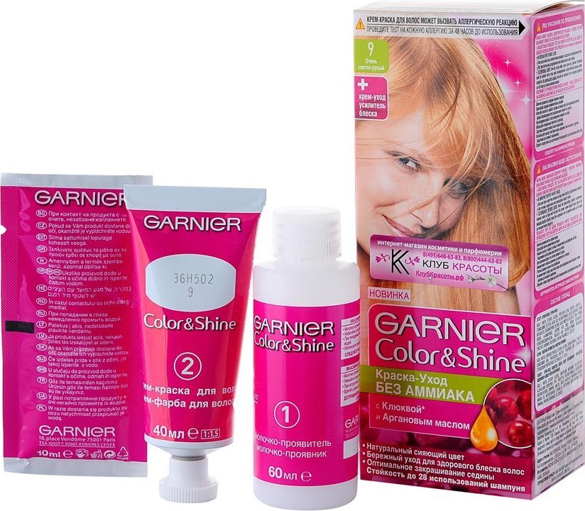 Color & Shine is a cream paint from the famous brand GARNIER.After using it, as the manufacturer assures, the curls will acquire an incredible glossy shine and smoothness. At the same time, the coloring product does not have a negative effect on the scalp and hair, because does not contain ammonia. And the herbal components included in the composition (argan oil, cranberry extract) have an additional caring effect. It is worth noting that the manufacturer emphasizes that this product is not intended for painting gray hair (although, according to user reviews, it copes with this). This paint is used to enhance the natural shade.