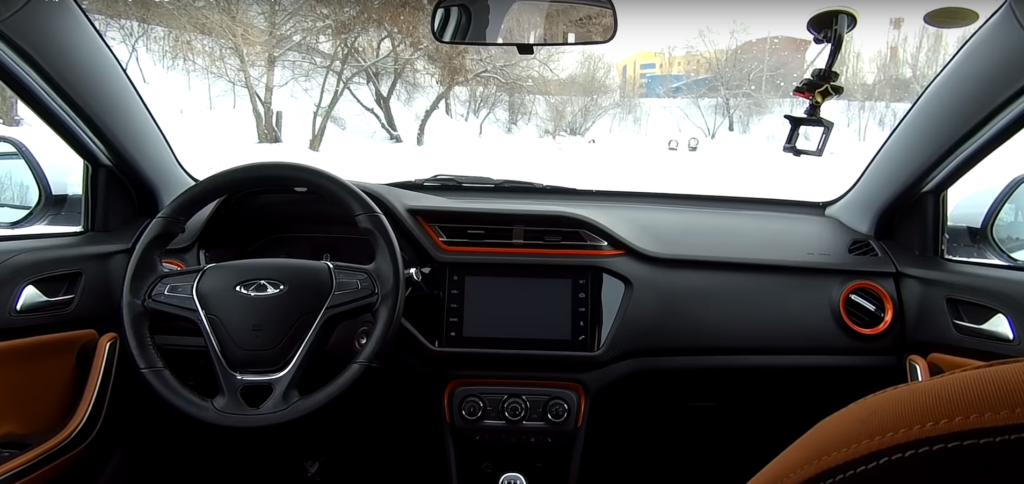 Well, and what Cherry's new product can not but praise for is, of course, the design and interior decoration. Both externally and internally, the car looks very attractive, and the combination of orange and black in everything from the dashboard to the upholstery of the seats looks just incredible.