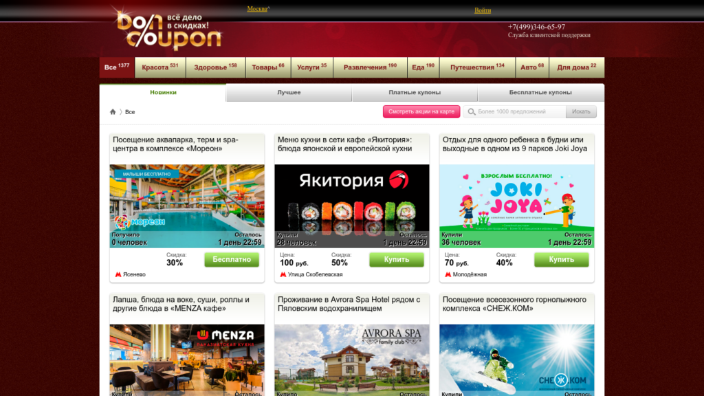 A portal on which the latest offers appear every day with a profit of 50% or more on a variety of services and goods, including restaurants, medical institutions, entertainment events and much more. It is very simple to use the search engine, all services are categorized, and customers are also offered to receive coupons for benefits for free, in order to do this you just need to select the appropriate one and click on “get”, then the system will send it to your mail or mobile. Payment for products takes place at the place of receipt with the discount indicated on the form received.After registration, all purchased forms will be saved in the personal account, that is, at any time the buyer will have the opportunity to print out the required one to receive the service.