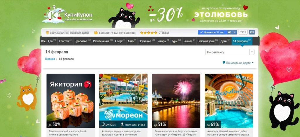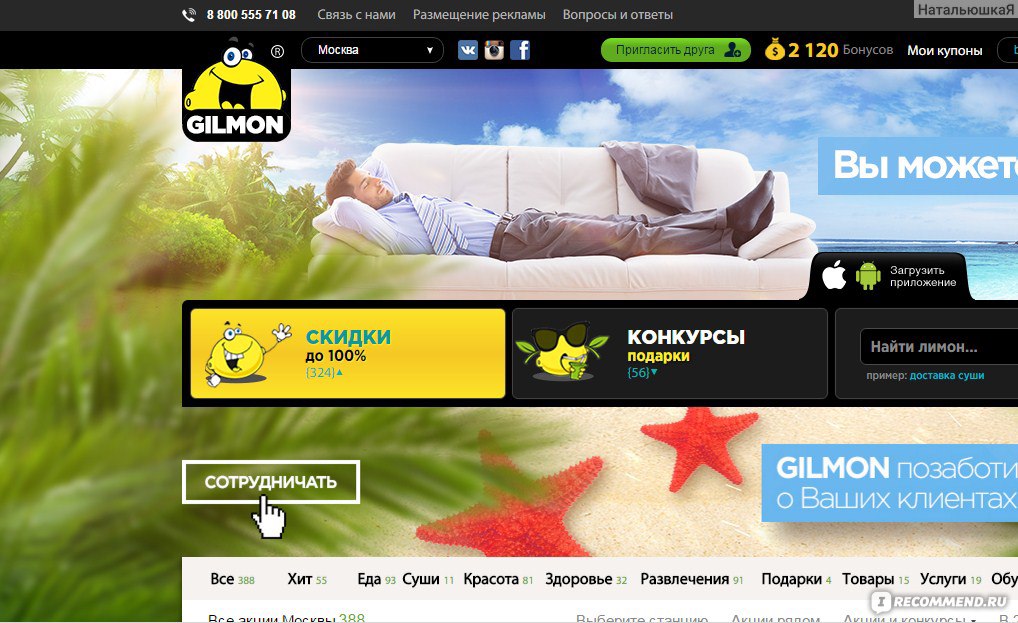 Gilmon.ru was founded back in 2011 and still successfully offers customers a variety of free discount forms for visiting various establishments, ordering products, including ready-made meals, going to the cinema and much more. It is easy to use, but, like everything else, it requires a couple of simple steps to register, besides this, there are some features, for example, the minimum fees are indicated, you need to become a member of the club, and others that you can get acquainted with in the process. It is possible to set to receive notifications when new products arrive.