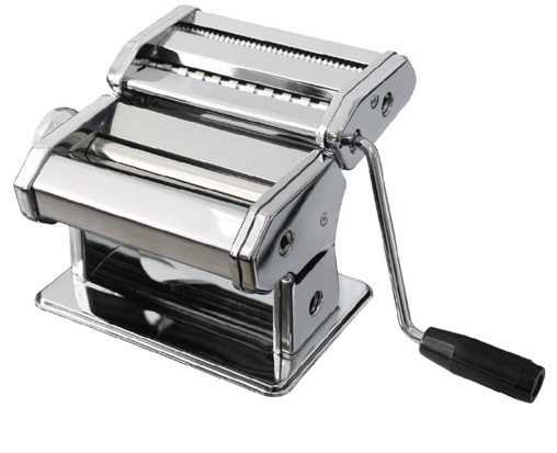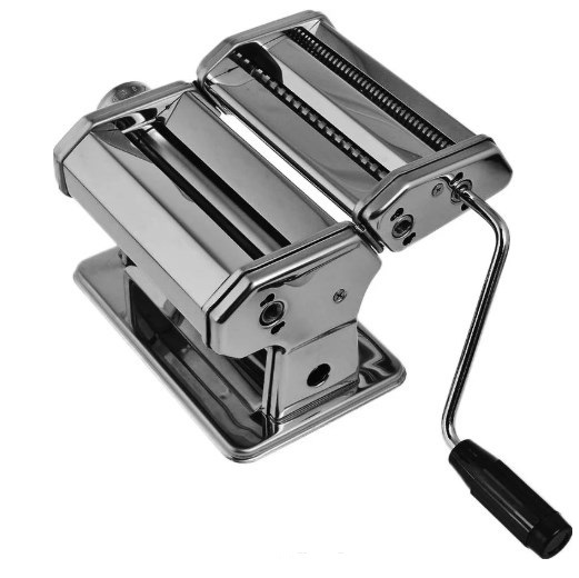 Clamped noodle cutter made entirely of corrosion resistant metal. The rotary knob is equipped with a black plastic handle that is ergonomically shaped but smooth. The design consists of two mechanisms: one rolls out the raw material (dough), the other cuts. It can be used as a rolling machine for sculpting dumplings, dumplings, making pizza base.
