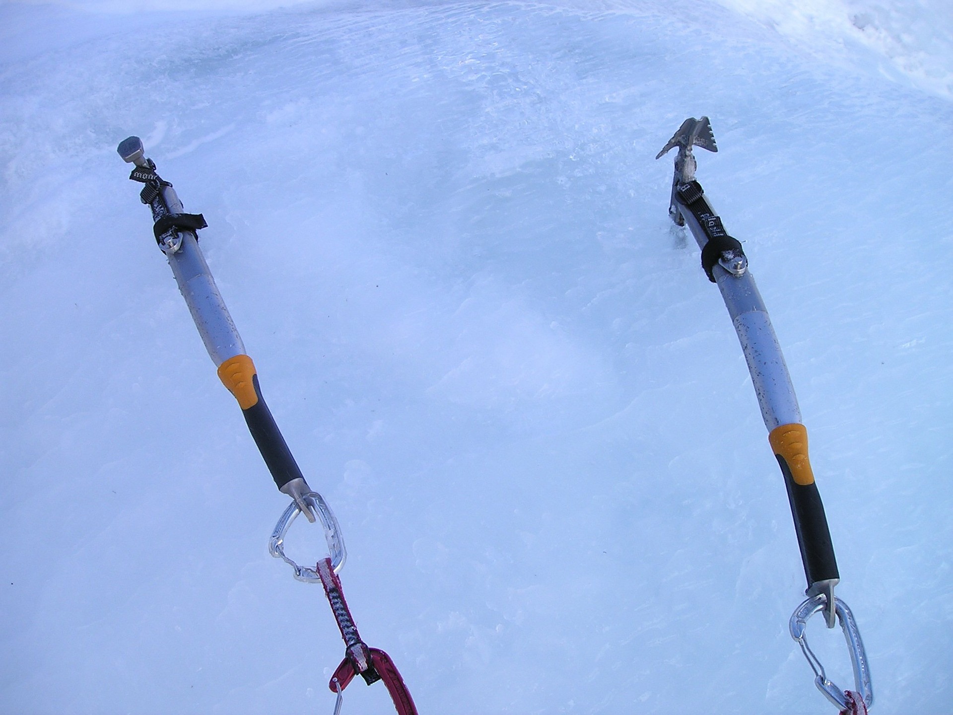 Long ice axes are great for summer ice. With their help, in loose ice, it is especially good to make so-called eyelets. These holes are often called Abalakov's eyes (in honor of the climber from the USSR Vitaly Abalakov, it was he who invented this method of fastening). Following this method, two holes are drilled in the opposite direction using an ice ax. Subsequently, a climbing auxiliary rope is passed through them. The most reliable one will be the attachment point that was drilled with the longest ice screw available in the equipment.