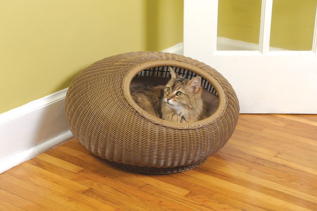 Baskets - Wicker baskets can be in the form of simple loungers or multi-storey towers that can hold several cats. The natural material of the house looks beautiful, like a piece of furniture. The sleeping area is upholstered in soft material or covered with pillows, and elements from the vine itself can also be used for scratching.