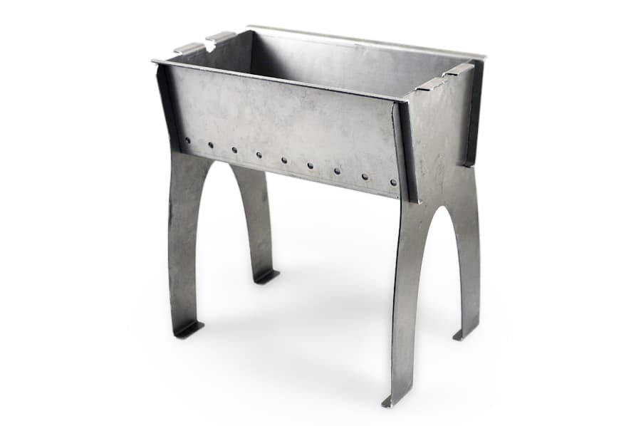 For the manufacture of a portable structure, sheets with a thickness of 1-2 mm are usually taken, which are fastened together with a corner. The size of the box itself does not exceed 250x600 mm, it is installed on low legs. May include a barbecue grill or a set of skewers. Since the box is small, in one approach no more than 7-8 ready-made portions can be obtained. From the point of view of the nature of the design, portable models are divided into folding and collapsible barbecues.