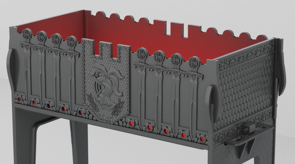 There are special holes in the corners that are for poker and other tools. Fully collapsible, which makes it possible to transport it in the trunk of a car. Skewers can be used long, which allows you to cook a large amount of kebab in one go. Skewer mounts are provided.