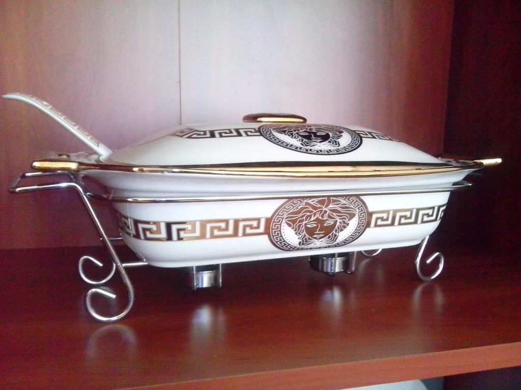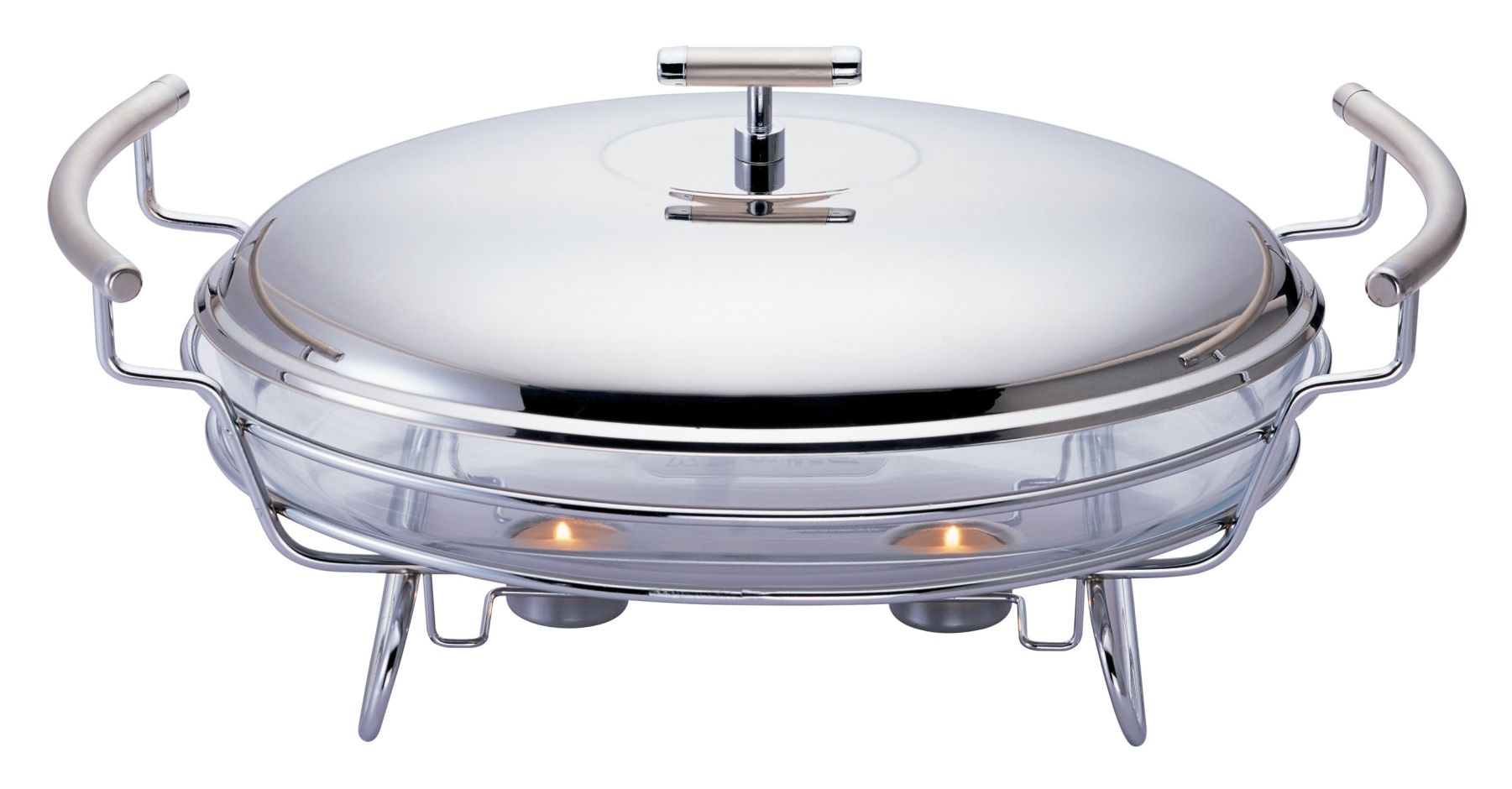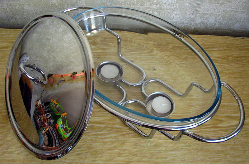 A three-liter container with a lid is installed on a stainless steel stand. The bowl itself is made of heat-resistant SABINEX glass (a manufacturer from France, which guarantees that the container will not form any chemical reactions with dishes, that is, it will not affect the taste characteristics of the products or dishes stored in it). Has a visually attractive oval shape. This allows you to place it right on the table without disturbing the harmony of serving. Candles are already included in the package. In this case, the container can be easily installed in a microwave oven or refrigerator.