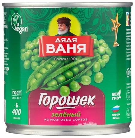 A domestic product made from ripe, carefully selected grains, peeled in a concentrated filling. Has a recognizable aromatic taste, which allows you to use it as an addition to hot dishes, side dishes and salads, as well as as a separate dish. The use of only natural ingredients in the manufacture significantly reduces the risks of allergic reactions. The tightness of the tin can reliably protects sterilized peas, providing a long shelf life.