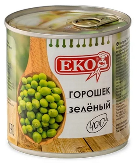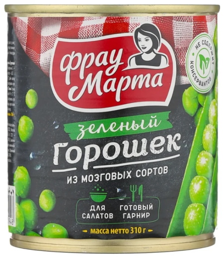 Natural canned product from high quality peas. The product with a dense and juicy consistency has a moderately sweet taste. Well suited as an addition to hot dishes or a side dish, it can be added to vinaigrette or salad, sauces or soups, as well as consumed on its own. An unusual type of jar with a volume of 310 grams with the function of a built-in key for opening.