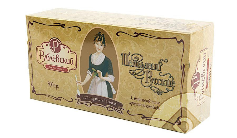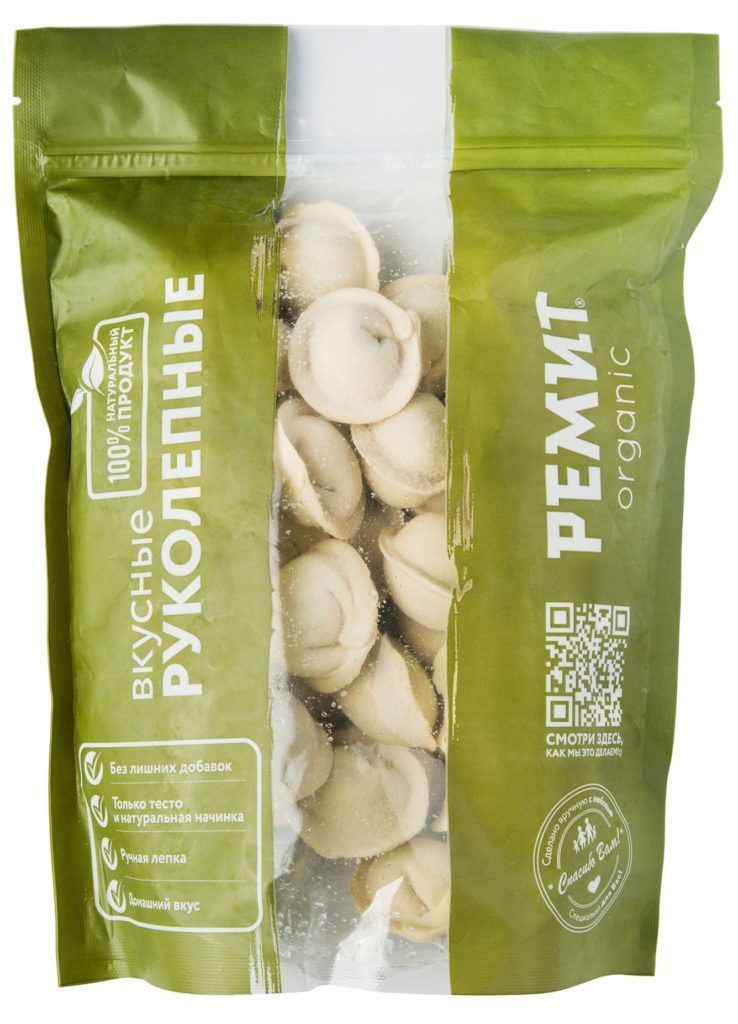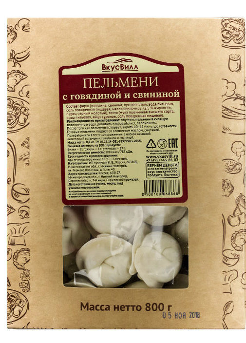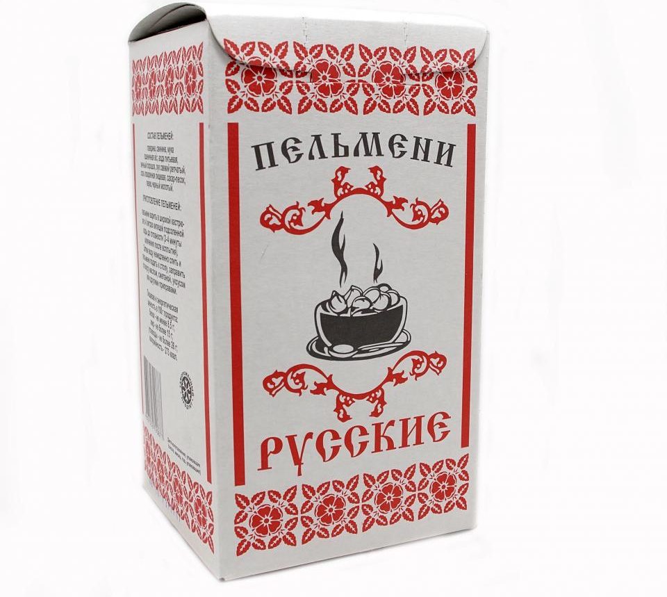 The first thing that attracts attention is the packaging. The design of the cardboard box looks more like candy. The composition is natural, the manufacturer even mentions artesian water (the source number is indicated). The dumplings are even, with a smooth surface of a pleasant creamy shade, without cracks and protruding minced meat.