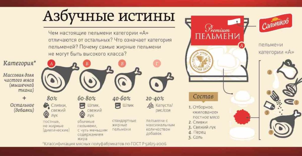 Finding semi-finished products of category A is quite difficult. Manufacturers add various spices and onions to the minced meat, so it turns out that less than 80% remains for meat. So when buying, feel free to choose semi-finished products of category B, C - it will be no less tasty.