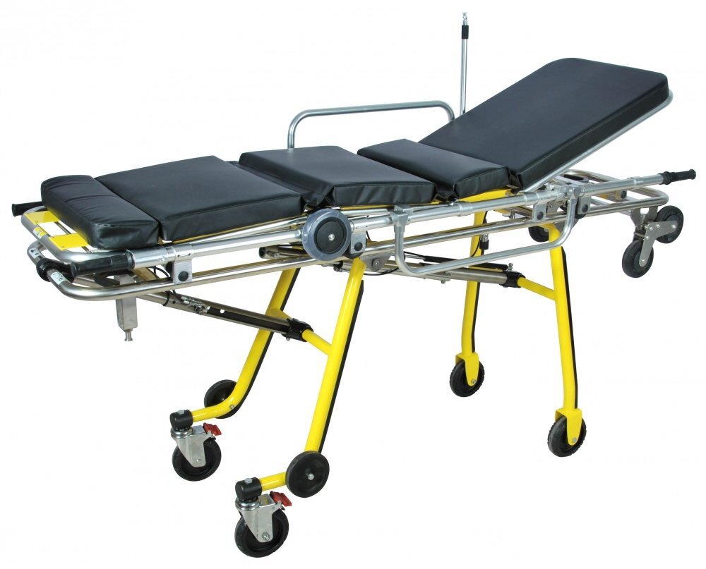 The model has a removable stretcher made of aluminum, which makes it lightweight. This is a great advantage for using the product in ambulances. The head and leg sections are adjustable. The side restraints can be lowered. The unit can be used for simple operations. The gurney can be converted into a chair. The mattress is made using a special fabric that repels moisture and perfectly tolerates disinfection.