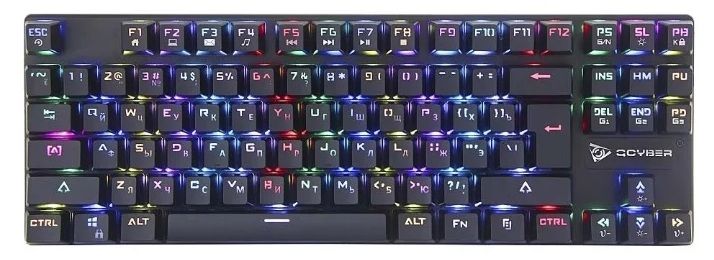 Black plastic keyboard. Purpose - for a personal computer. Connected via wire. Equipped with a keyboard with many color modes and a number pad. It is compact in size but full-length. The layout is Russian and English.