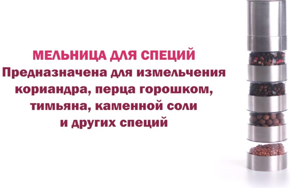 High quality steel was used to make the shell of the electric mill. The transparent windows are made of plastic and the millstones are made of ceramics. Capacity - about 40 grams of pepper.Power is supplied by 6 batteries. Convenient to use, to start you need to press the button on top. Virtually silent. There is a light bulb at the bottom with a nice shade of blue, which helps to better discern the amount of ground spices. The average cost is 1,146 rubles.