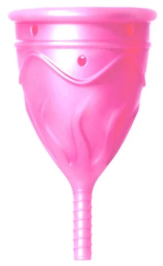 "Eve Talla" from the Spanish company "Adrien Lastic" is made of silicone and comes in pink. The platinum silicone from which this bowl is made does not cause allegri, and this hygiene product can last up to 10 years. Available in two sizes. Size S is for women with a small discharge, it is 48 mm long and 32 mm in diameter. Size L is suitable for women who have given birth or who have heavy discharge, it is 60 mm long and 38 mm in diameter.