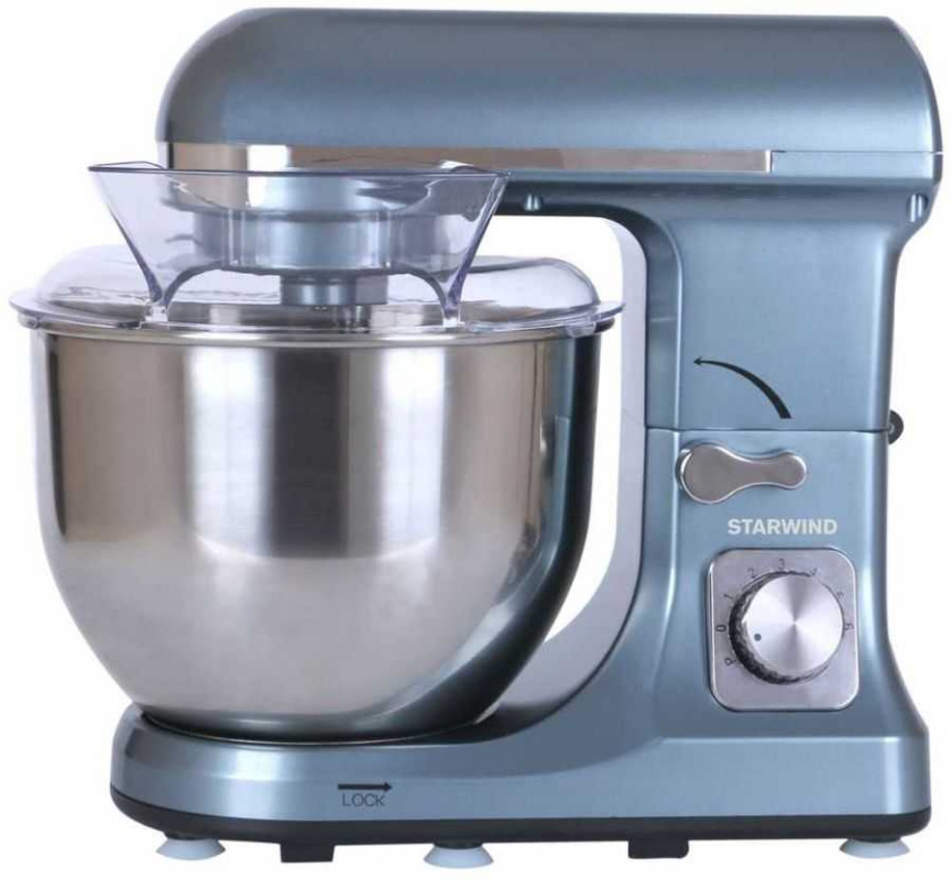 A fairly powerful stationary device (1600W) is assembled in China, has 6 speed modes and an additional pulse, the supplied parts are made of metal, including a 7 liter bowl. In addition, the set includes a spatula made of silicone and a lid for the bowl. The device itself is stably fixed on the panel due to the existing suction cups.