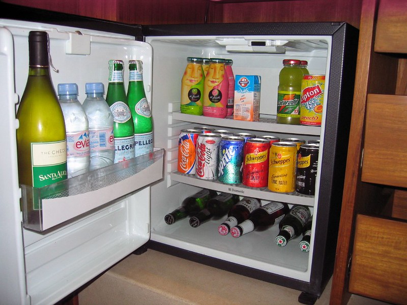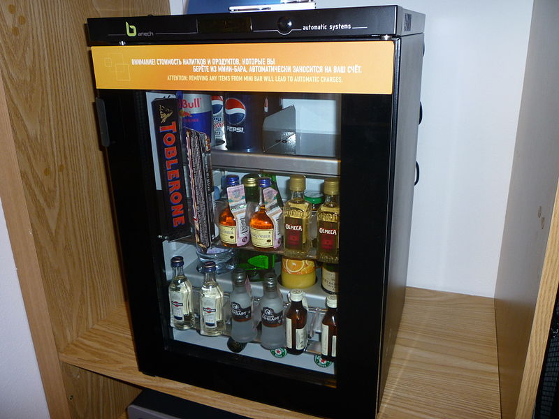 So, a mini-bar is a small refrigerator that can be built into furniture. It first appeared in the early 60s of the last century. Initially, such devices were used only in hotels. The lodger could find several types of spirits, wine, beer, glasses and small snacks there. Also, expensive hotels for regular customers filled the bar at their request. The cost of food and drinks in the minibar is significantly higher than the cost of similar goods that can be purchased in the bar of the same hotel. Later, special automated systems were developed that began to keep records of what was in the refrigerator. The guest is given a certain time to examine the product, and in case of no need to return it to its place. Usually this time does not exceed a minute. Also, for greater convenience of guests, these products in most cases have a transparent door. The volume of minibars is usually around 20-90 liters. Some models may have a small freezer.
