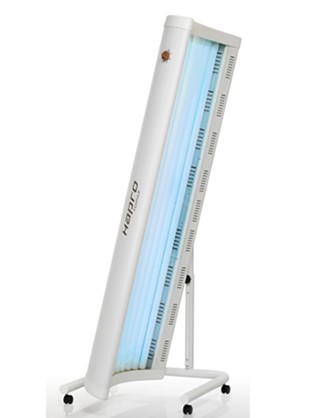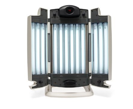 Another device from Hapro in the ranking is a one-sided model of home use in any position for the whole body. When folded, it takes up no more space than an ironing board. The panel of the device is mounted on a metal tripod, easily changes the angle of inclination from vertical to horizontal at the request of the owner, can rise from the floor surface by 86 - 114 cm, quickly returns to its original position, without taking up much space during storage.The wheeled stand allows for easy transportation indoors. Equipped with 10 x 100 W body and one face, 400 W. This allows you to achieve an even noble complexion of the face and the whole body in just a couple of sessions. An electronic timer for 30 minutes, a session memory system for 4 people, an automatic shutdown function make the use of the device easy and comfortable. One year warranty.