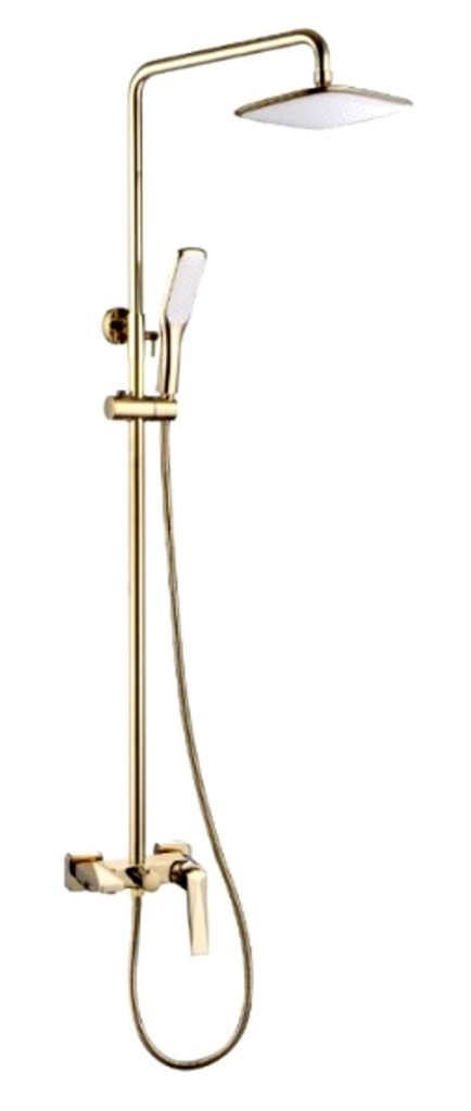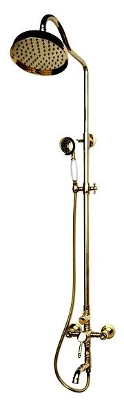 The modern single lever device can beautify any bathroom.The manufacturer did its best and made stylish high-quality products with a long service life, completely safe, convenient and reliable. The diameter of the overhead shower is 200 x 200 mm. The gold color allows the counter to blend in with the rest of the bathroom. Dimensions - 38.5 x 122.3 cm, material of manufacture - brass.