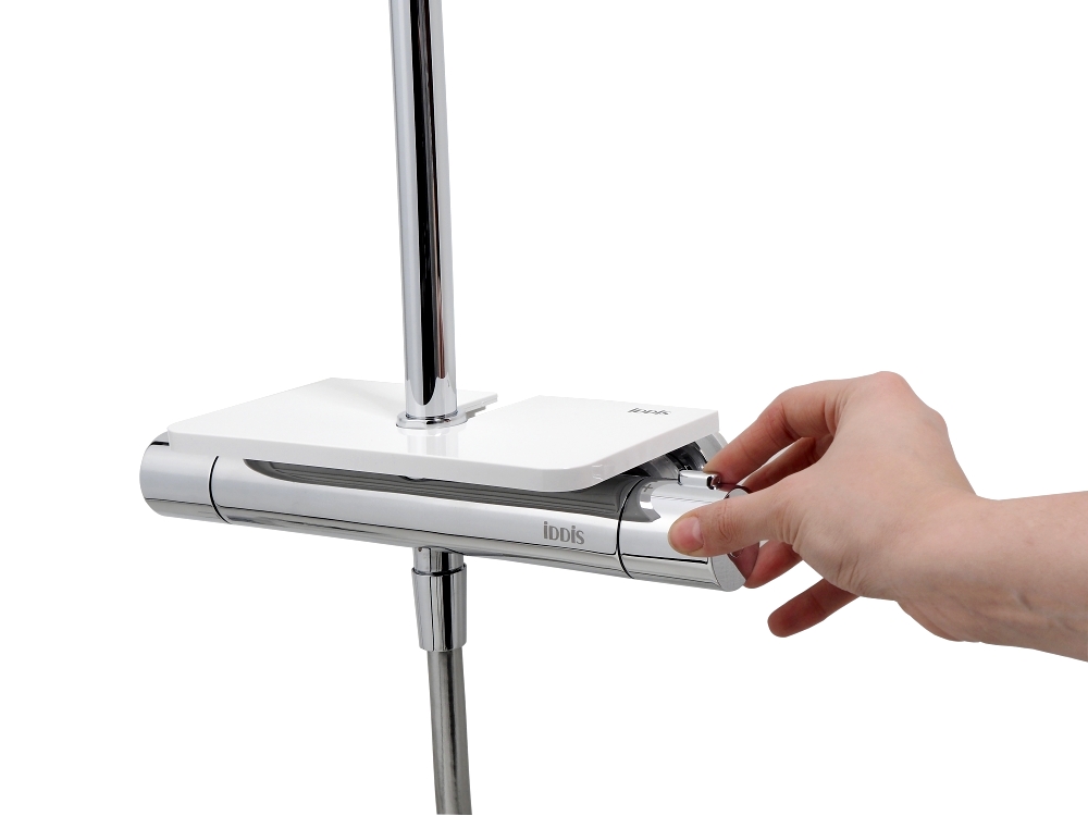 The rod is equipped with a removable shelf without sides. It's easy to tidy up. The walls of the mixer are too thick to protect the mechanism from temperature extremes. The thermostat is equipped with a temperature limiter for safe shower. The maximum indicator is 38 degrees.