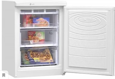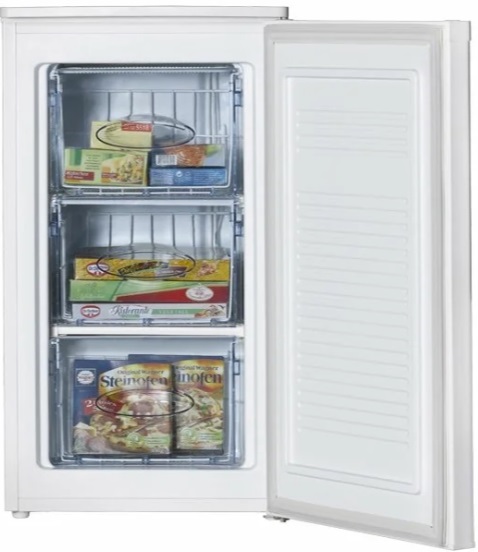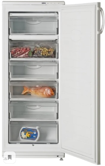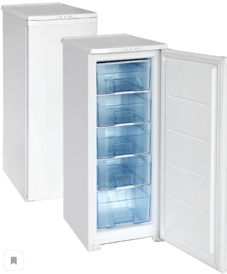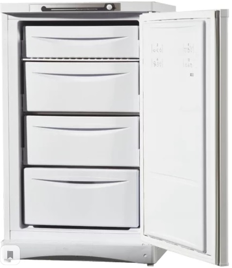 Narrow upright freezer.Compact size, white, plastic coated. The model provides for re-hanging the doors to the opposite side. Capacious drawers help to organize products into categories: berries, vegetables. For fish there is a lower separate box, oversized. The drawers have no guides, so it is worth holding them at the maximum extension.