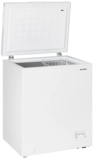 The white metal-plastic compact chest is a horizontal type freezer. Maintains a minimum freezing temperature of -18 ° C. There is an additional 12 month warranty service. A large volume quickly and efficiently freezes a large number of products.