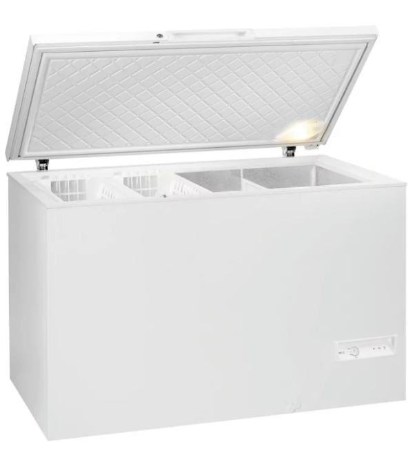 The chest of the Slovenian manufacturer is distinguished by its power and capacity. With a total volume of 400 liters, the usable volume is 380 liters, and the daily capacity for freezing food reaches 26 kg. Without power supply, the freezer can stay up to 38 hours and perfectly maintain the internal temperature in autonomous mode. For ease of use, there are small divisions inside for sorting products, as well as a hanging section in the form of a basket. Additional functions include super freezing, light indication when the door is open. The model is characterized by an almost silent compressor operation (43 dB).