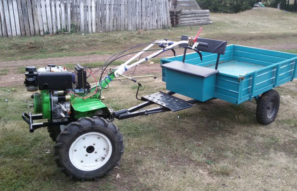 The walk-behind tractor is capable of carrying loads in excess of its own weight twice. Engine power and weight are enough for such a difficult task. It is often used as a mini tractor, since it is capable of doing its job, but it costs an order of magnitude less. The trailer is sold separately in the store, but some craftsmen make their own from improvised means. It is very popular with summer residents and owners of small farms due to its versatility.