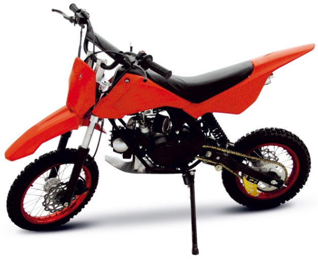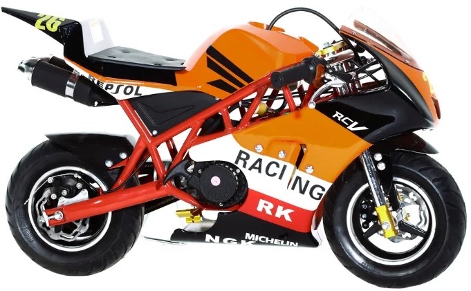 Sports road bike for professional use. Suitable for the spring-summer period in open areas or indoor motorcycle tracks all year round.Small in size. Suitable for girls with small stature. Orange construction. The seat is plastic, horizontal. The tank is used to hone various elements: cornering, for example.