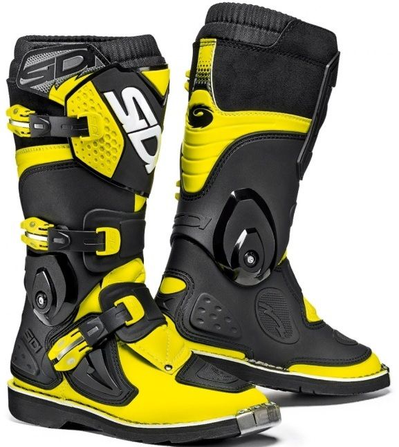 Two-tone (yellow + black) boots with high shins from the smallest to the largest. The system is equipped with three fasteners that tightly fix the foot in the boot; anatomical heel resistant to physical damage; polyurethane protection of bones and areas for gear shifting; rubberized sole and fixed shin guard.