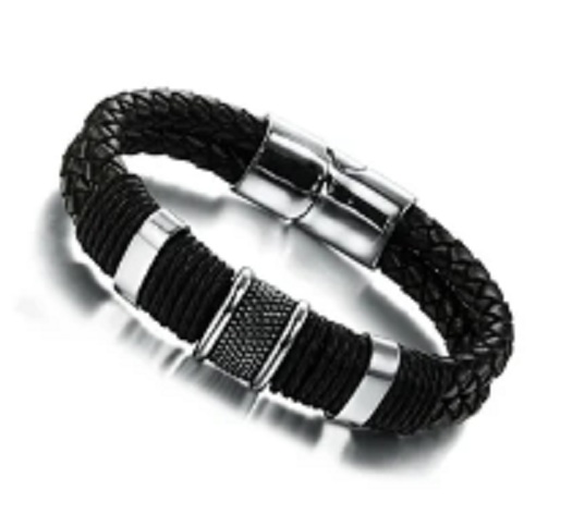 The wide accessory for the male wrist creates a stylish look.
