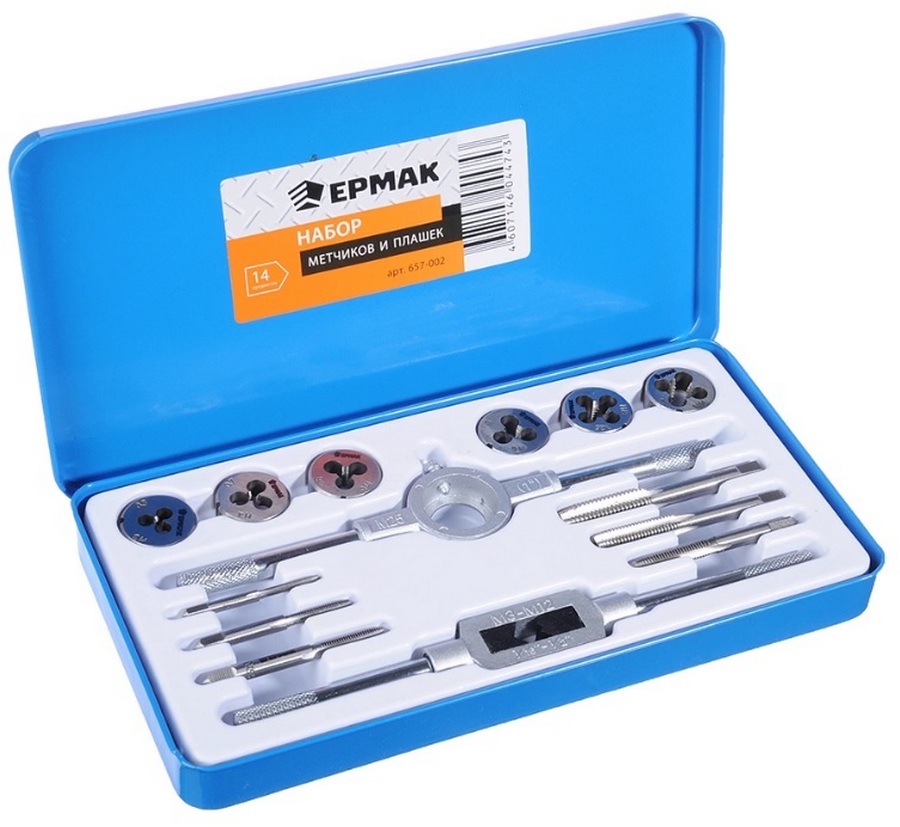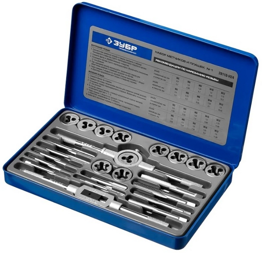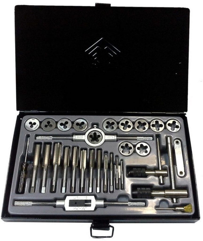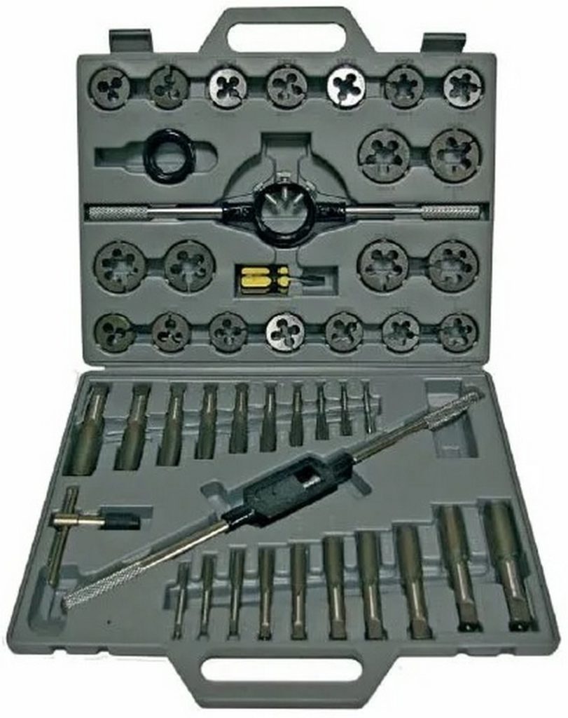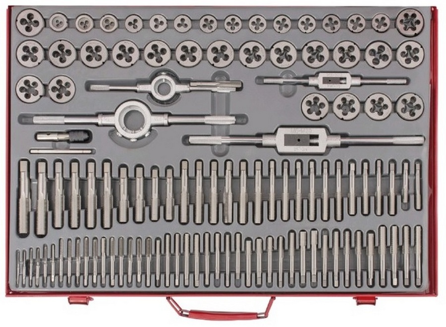 In many ways, a universal kit, because it can be used both for the locksmith and for the automotive part. Most of the dies and taps for standard threads are present in it. Excellent quality of sharpening allows you not to use excessive force when working. The case is made of steel, has a strong lock.