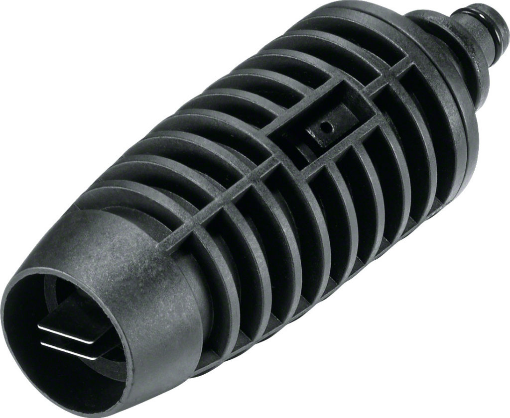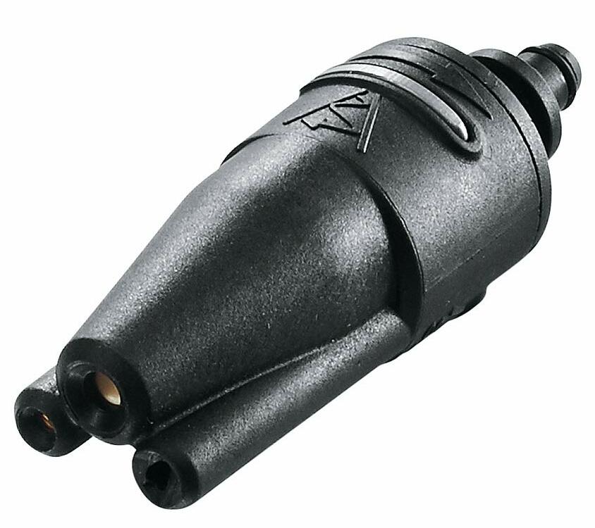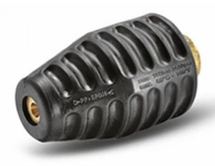 Rotary nozzle for high pressure washers. As it exits, the water forms a rotating point stream that effectively removes stubborn dirt. It is actively used for cleaning vehicle surfaces, as well as removing moss from the surfaces of buildings and garden paths.