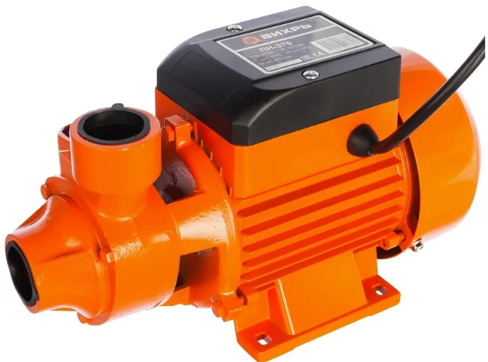 The principle of operation is an impeller (massive steel disc), blades are attached to it. The wheel rotates in a cylindrical body. Water is sucked in through the inlet, which then, under the influence of the vortex flow, moves inside the working chamber and is thrown out of the outlet openings under a large set.