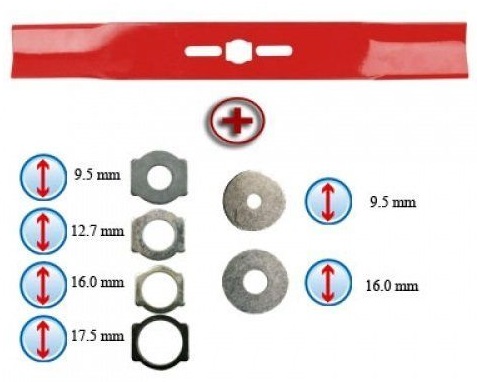 The set includes 4 adapters with bore 9.5 mm, 12.7 mm, 16 mm, 17.5 mm. Also supplied are 2 pressure washers (9.5 and 16 mm dia.) To ensure that the insert fits snugly on the drive shaft. The shape of the blade is straight, without protrusions and notches, it allows you to evenly mow the lawn, while it is unlikely to cope with thick stems of plants. Buyers note quality steel and a sharp blade. The length of the cutting element is 46 centimeters, the average price is 1,600 rubles.