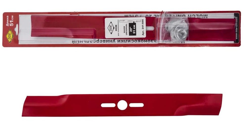 Despite the fact that the knife in question is positioned by the manufacturer as intended for the Universal Shark 20 ″ / 51 cm model, it can also be used in conjunction with lawn mowers from other manufacturers. The product is painted red, made of stainless steel, which prevents the formation of corrosion. The blade length is 51 cm, which provides a large mowing area. The inner diameter of the bore is 25.4 mm.