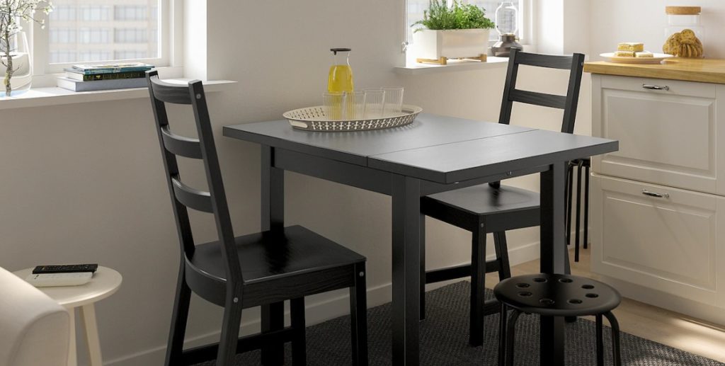 Lunch group from Ikea, designed for a family with one or two children. The set includes a square table 74 cm * 74 cm, 2 chairs. The length increases to 104 cm with the help of a folding shelf. Greatly saves space in small kitchens. The stability of the structure is given by the underframe made of solid pine. The veneer tabletop is covered with a moisture-resistant varnish. The product has passed all tests, checks and is considered safe for life and health. The furniture is not suitable for garden use. The chairs have also been tested. Convenience is provided by a rounded back that provides lumbar support. It is convenient to place the table in the corner, near the wall, and if necessary, the light table can be easily pulled out to the center of the room. Price: 14,997 rubles. Registration of delivery, assembly is possible.