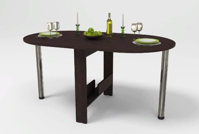 For a small kitchen, a folding table with a length of 50 cm (folded) would be an excellent solution. It doesn't take up much space. Fits into any corner of the room. This unfolded furniture can accommodate up to 6 people. However, such a dining place also has disadvantages. The assembled product accommodates two people who eat in an uncomfortable cramped state. This can be avoided by choosing a larger table from 120 cm. Also, with frequent mechanical stress, when unfolding, there is a possibility of rapid wear. The table top can wedge and the legs will become loose over time. Such models are made from a felling of a tree, chipboard, MDF.